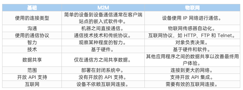 IoT和M2M之間的最大區別在于連接。物聯網通常是連接到互聯網以增強性能的任何設備。另一方面,M2M通常是兩個或多個與互聯網連接的設備,用于數據共享和分析。