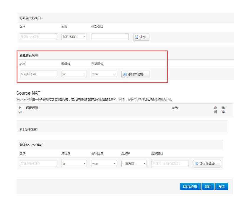 五、 在“新增轉發規則”處添加規則名稱,規則名稱為 “允許服務器”,并點擊添加并編輯按鈕